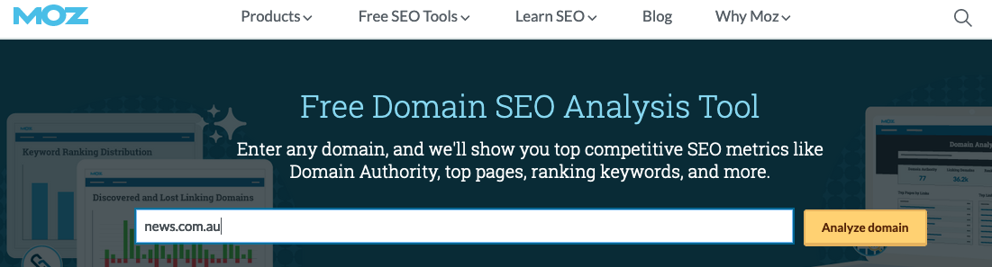 You can find out a website’s domain authority by using Moz’s free domain SEO analysis tool: