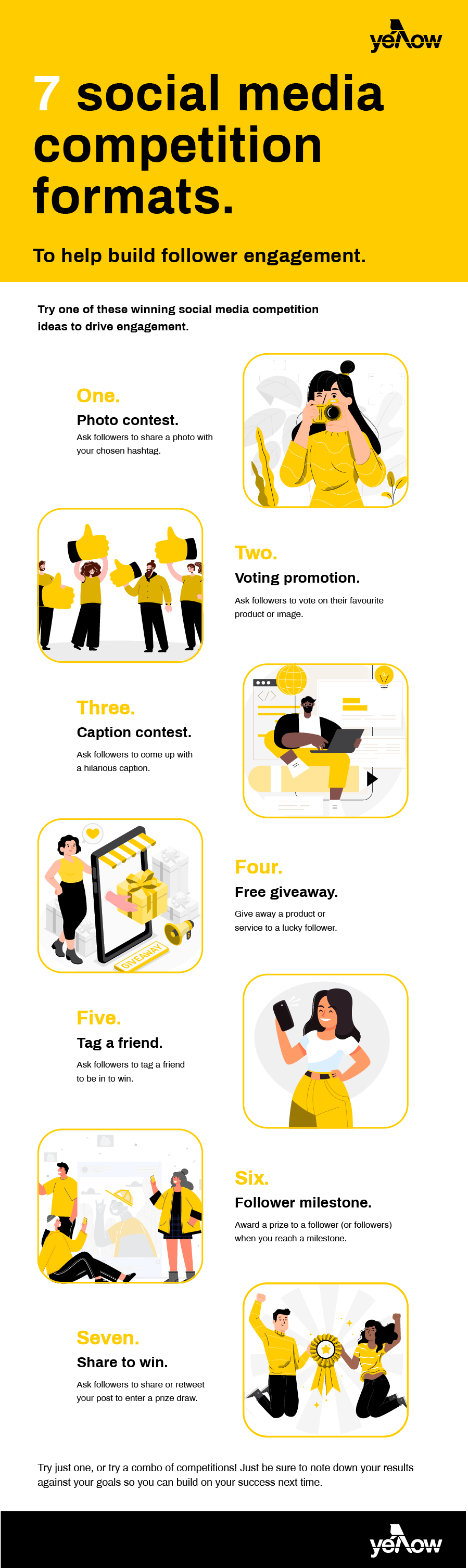 This competition format will be specific to a platform, and will select one lucky follower (or any number) to win a prize simply by following you. Make the draw once you reach your milestone, and don’t forget to reward new followers with fun, interesting, and useful content even if they don’t win.